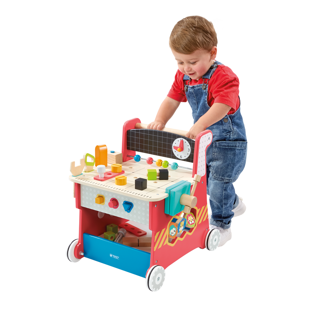 Imagine an activity workbench that grows with your child! This awesome set is two toys in one: a sturdy walker for kiddos 12 months and older taking their first steps, and then when they’re 2+ years old, a standalone activity workbench! Each sturdy wooden tool has realistic functionality, from screwdrivers that fit into matching screws, to a functioning vise, hook-and-loop fabric for realistic sawing action and a real chalkboard surface. There’s even a clock face with movable hands to help teach children how to tell time. This 23-piece set contains so much play value: shape sorting, hammer tapping, gear turning, bead counting, pretend sawing — and best of all, tools store in color-coded holes, with a storage tray below for everything else.