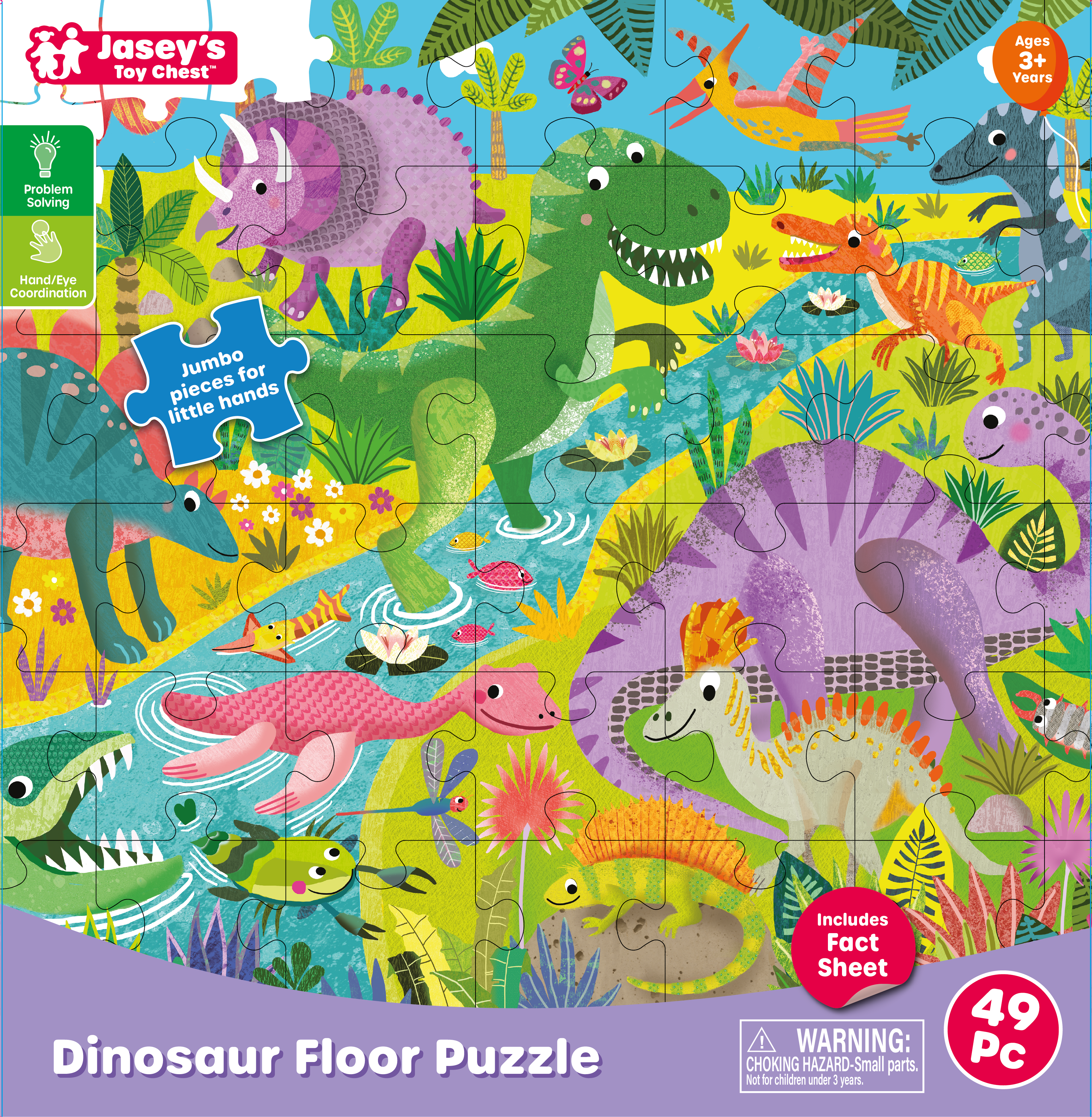 This jumbo 48-piece puzzle is big, bright, and built for little hands. Pieces are extra-large, durable and chunky for easy gripping and long-time use. The fun extends learning beyond puzzle time with a dinosaur fact sheet, filled with illustrations that directly match the puzzle artwork. It shows where each dinosaur lived, what they ate, a fun fact, and phonetic pronunciation guides to help youngsters learn how to say those tricky names, all written at a 3-year-old level. Parents can feel the quality for themselves before they buy with a try-it-yourself puzzle piece looped on the carrying rope featured on the box. The completed puzzle is approximately 2 feet tall and 3 feet wide.
