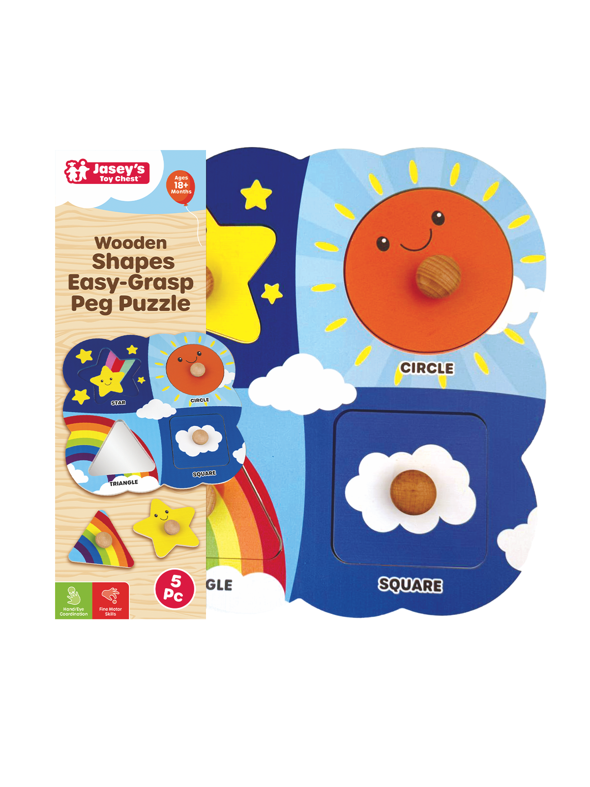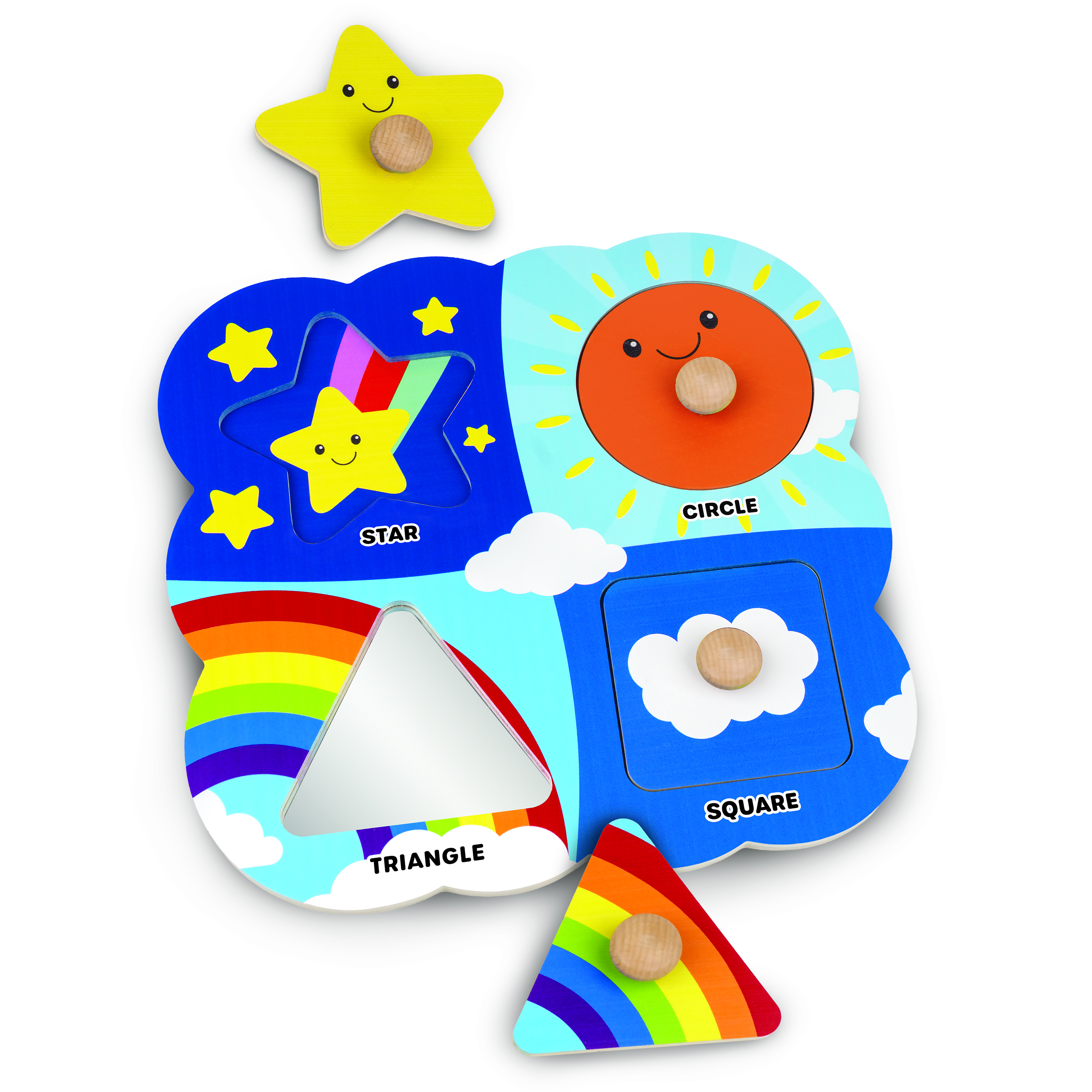 For those who are brand new to the very concept of puzzles, check out this peg puzzle fully designed for beginners! Chunky easy-grasp pegs support each shape, designed specifically for developing fine motor skills in toddlers. Each shape matches to a colorful and cute illustrated background: sun, clouds and rainbow (plus a hidden mirror under the triangle for a fun peek-a-boo surprise!). This bright and sturdy peg puzzle teaches four basic shapes: circle, square, triangle, star, all with labeled names.
