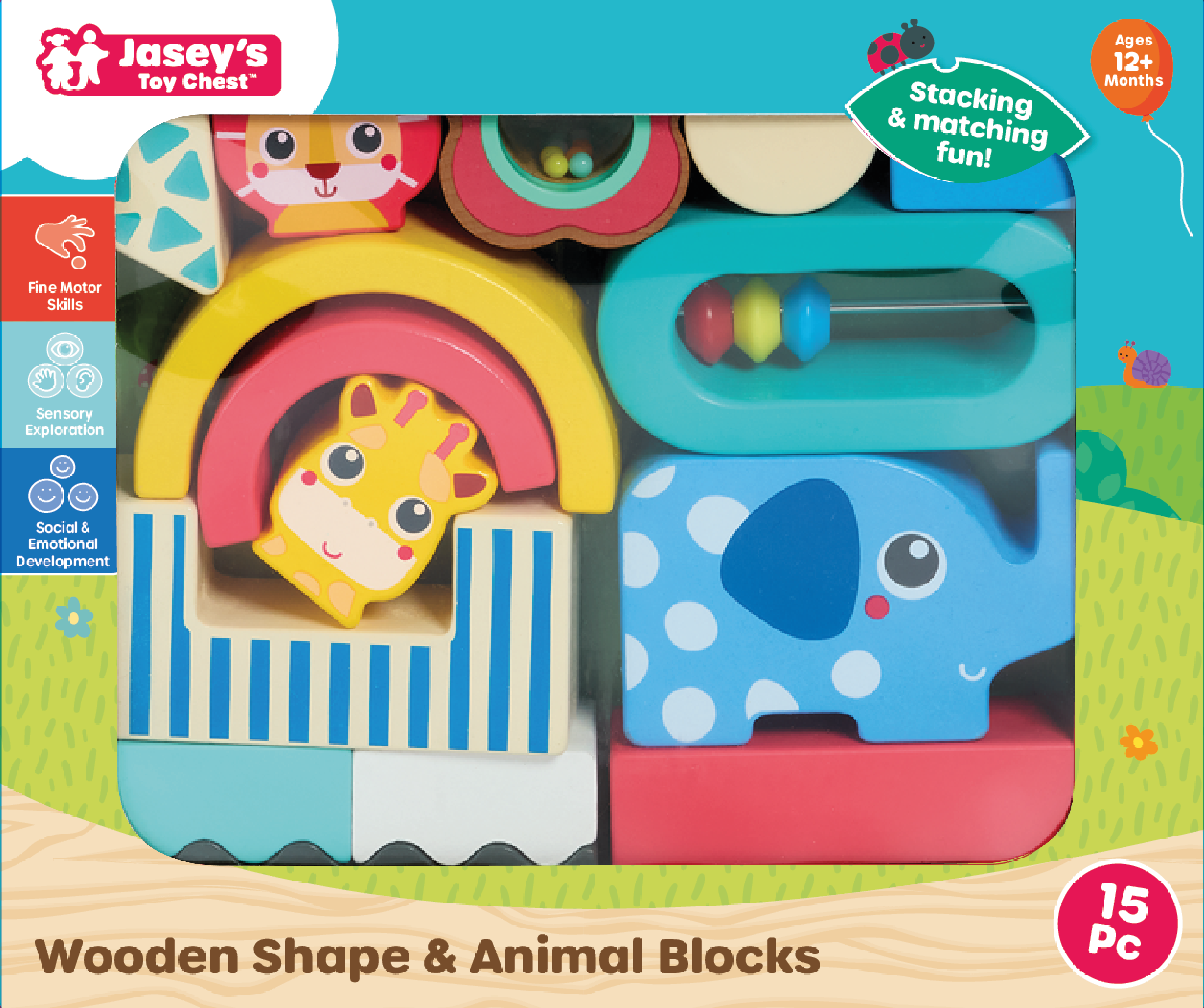 Take note: this is not your average block set – these blocks do things! This set of blocks incorporates a multi-sensory experience: different blocks have rattles, a jingling bell, and even a real mirror! This 15-piece set features unique pieces with adorable animal characters and patterns – decorated on every side. Squares, circles, triangles and arches – all blocks are chunky and easy to grasp for little hands. The variety of shape and sensory features encourages explorative and experimental play!