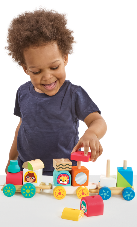 Animals and trains, what more could a kid want in their toy set? This classic toy train is reimagined with clever critter details! Cute animal characters and colorful patterns adorn this rolling toy train, setting it apart from the typical solid-color blocks most stacking trains offer. This 16-piece set includes 3 train cars and 13 colorful stacking blocks in a variety of shapes, featuring 3 adorable animal characters. These connectable cars have a safety-first design – the pegs that connect the cars are bendable and will flex rather than poke if a child were to fall on them. A built-in mirror on one of the train cars adds peek-a-boo fun. Connect the cars in any order and chug-a-chug-a forward with push-along play!