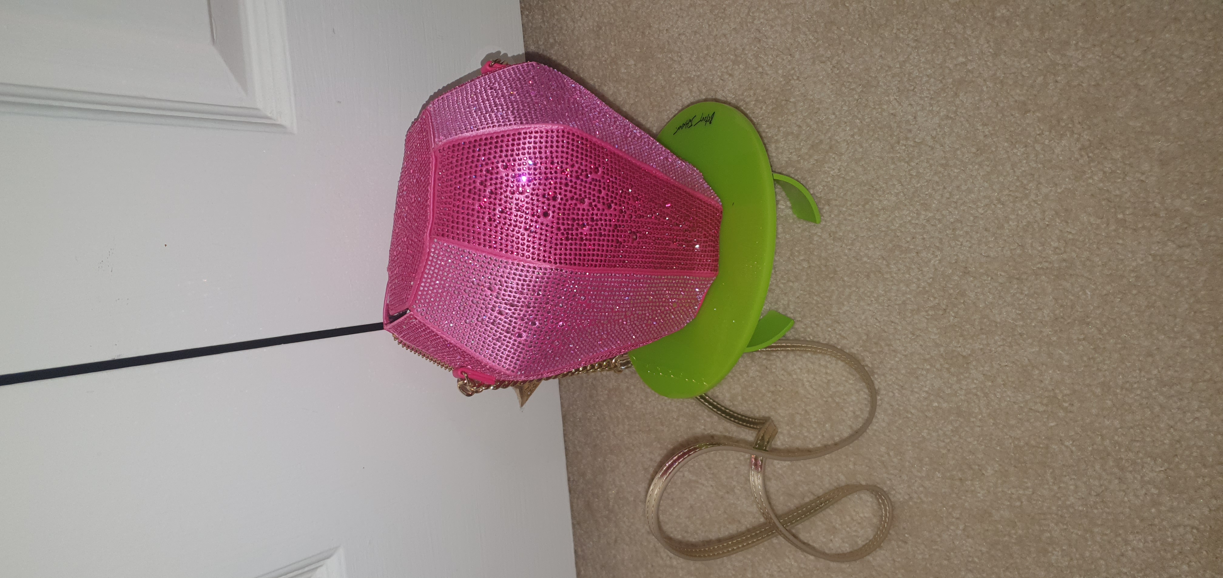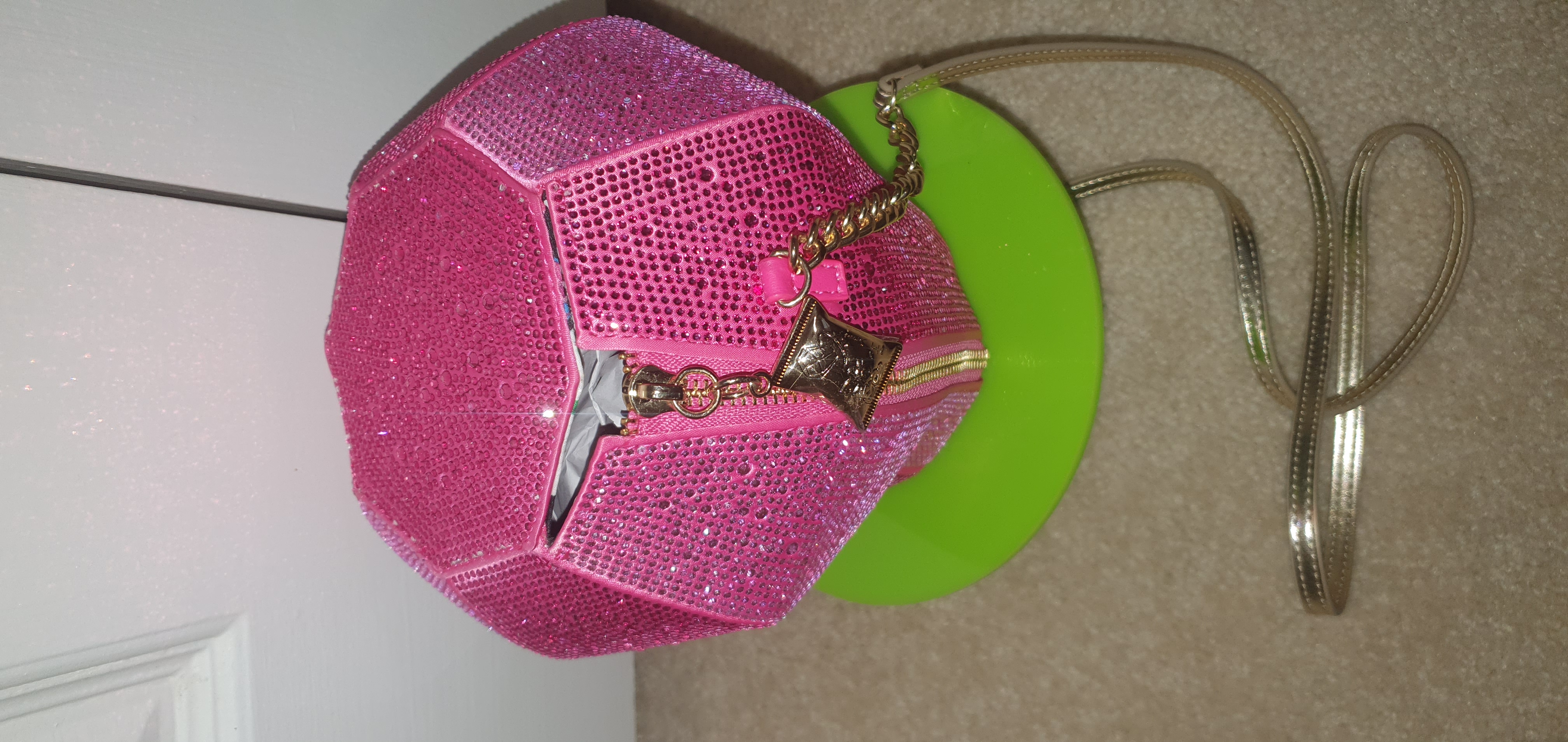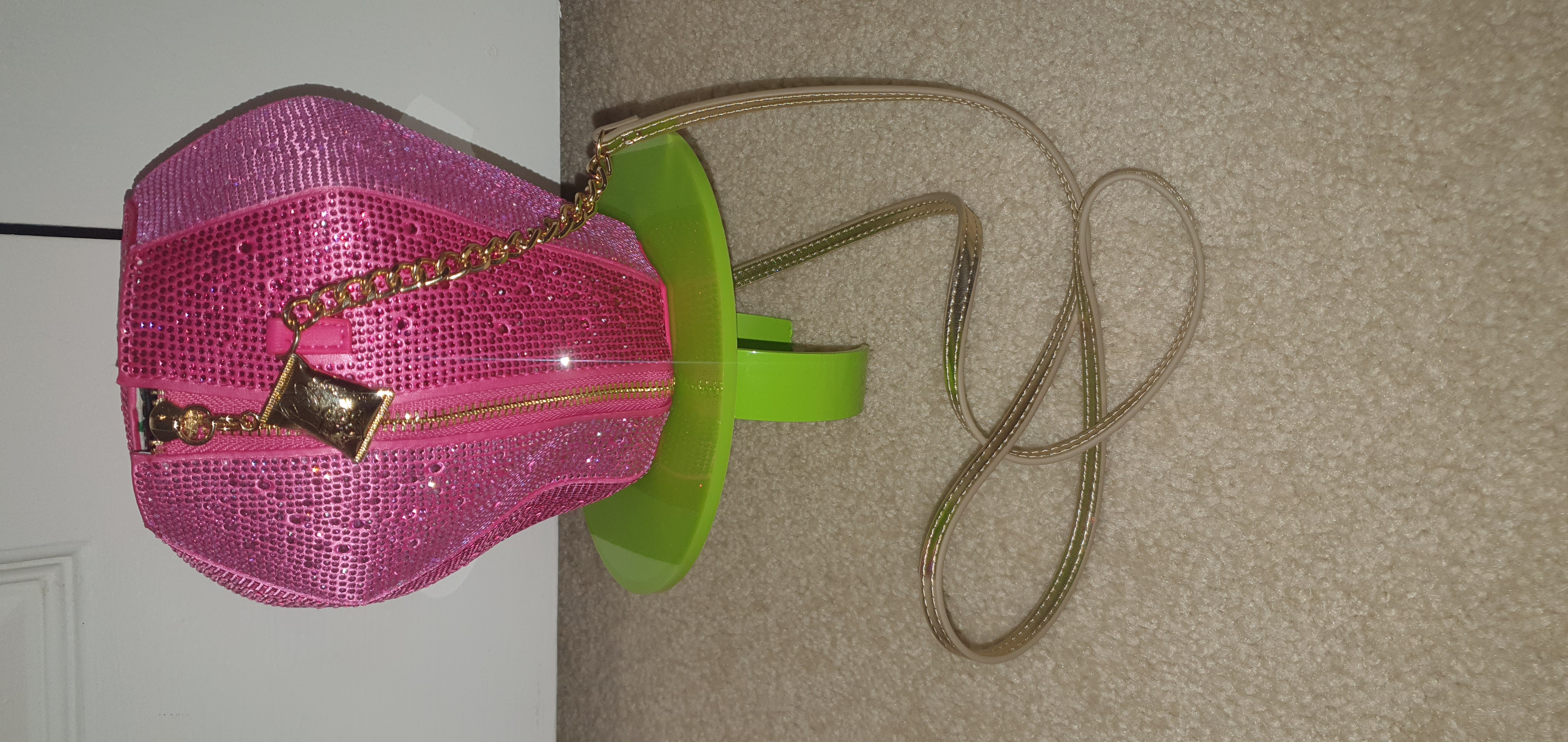 Betsey Johnson collaborated with the Bazooka Candy Brand to create a line of Ring Pop Purses. The Ring Pop purse line contains a variety of crystal encrusted clutches, wallets, and bags. I purchased the Crystal encrusted RING POP® PUT A RING ON IT CROSSBODY PINK. The purse cost roughly $100 . I ordered it via the Betsey Johnson website and received it a few days later.