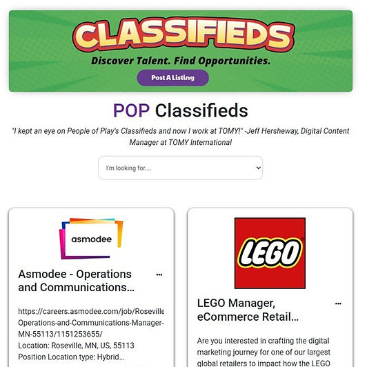 "I kept an eye on People of Play's Classifieds and now I work at TOMY!" -Jeff Hersheway, Digital Content Manager at TOMY International