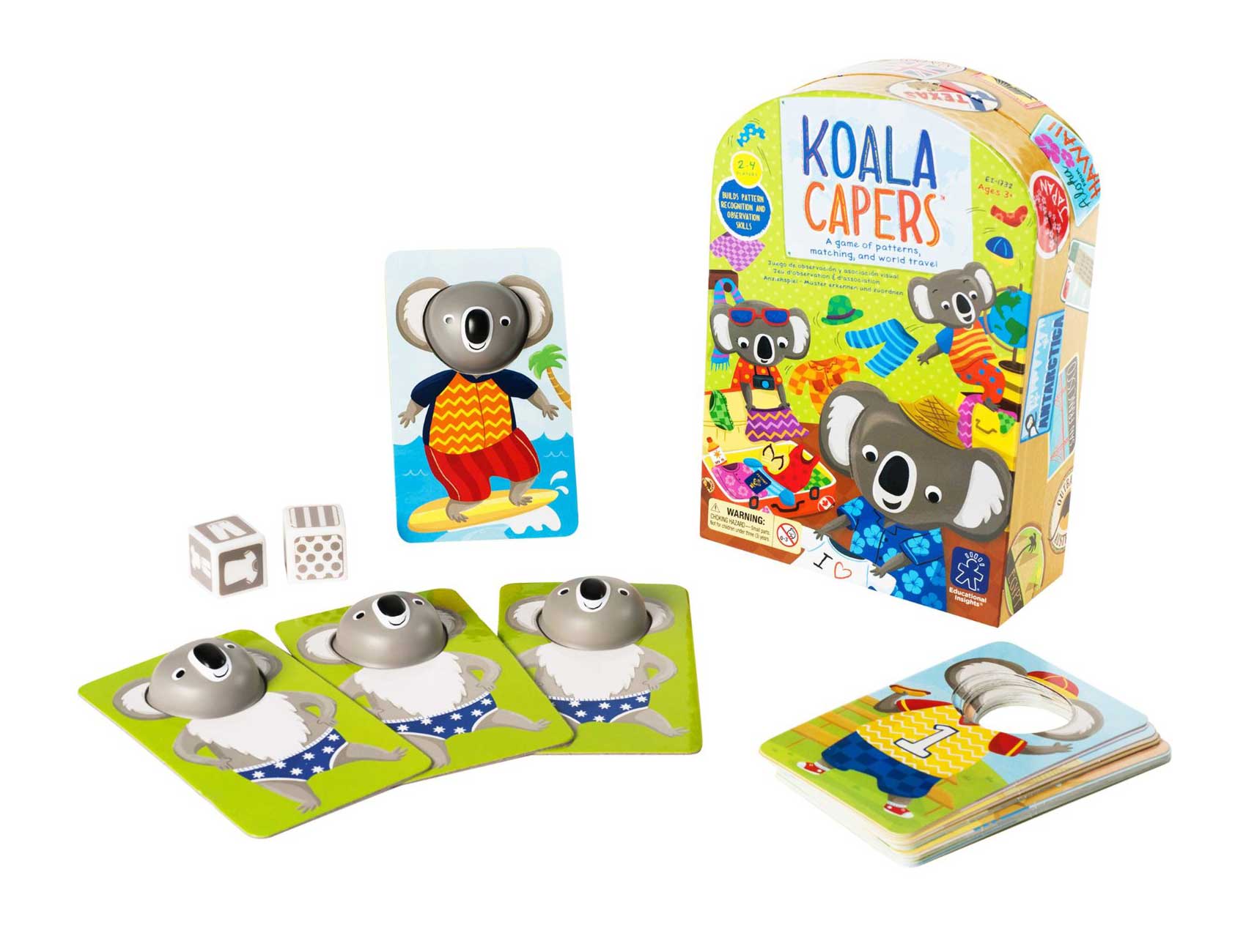"The Koala family wants to travel the world, but first they've got to get dressed! Help them find a few outfits in this fun, matching game, but watch out for the underwear dice roll. It just might put a wrinkle in your plans! Collect five outfits first, and you win! Includes bonus memory game. " From Educational Insights Webstie