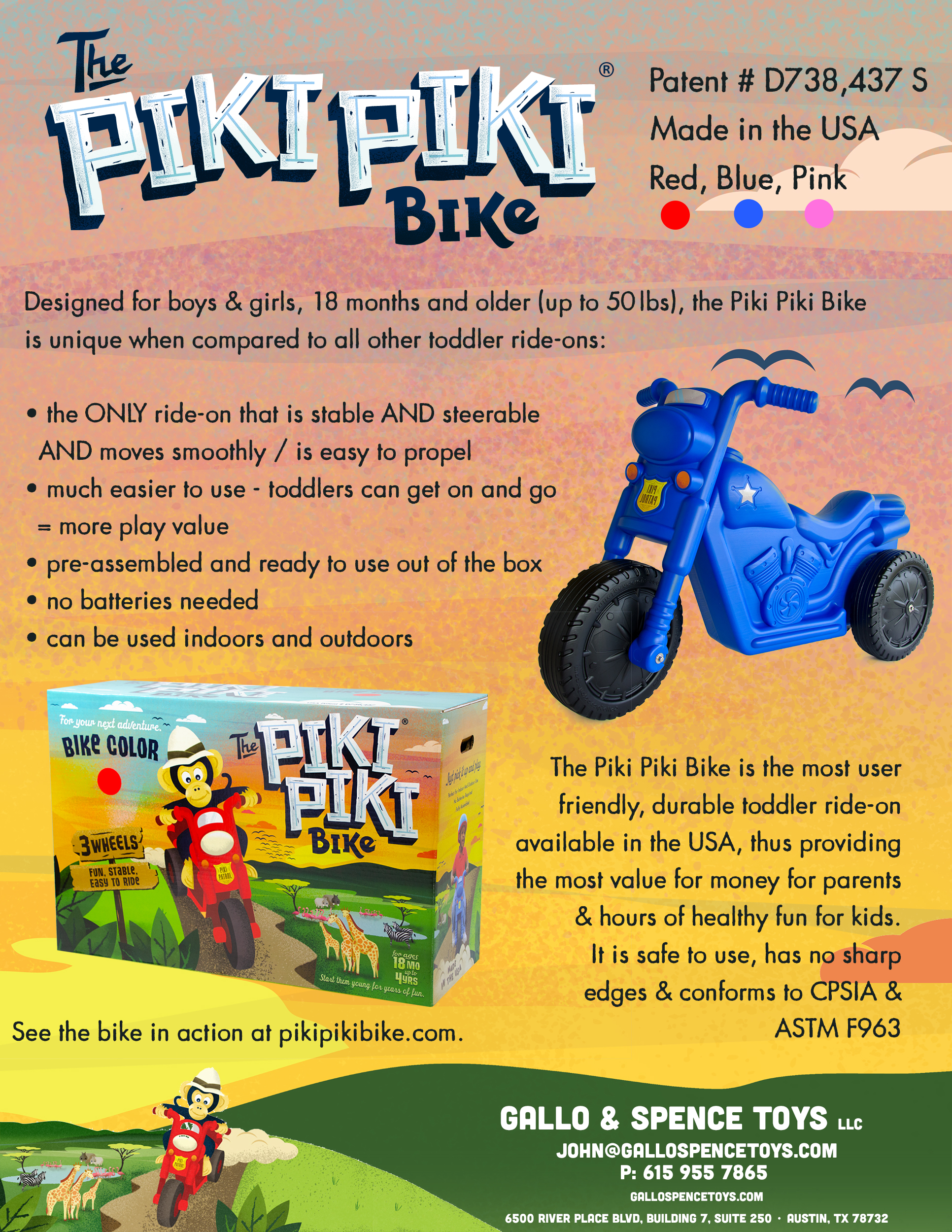 The patented Piki Piki Bike is a ride-on that toddlers can use easily & with confidence right out the box. It is the ONLY ride-on that is steerable AND stable AND easily propelled by toddlers. It is stable & requires no balancing and is available in 3 colors - blue, red and pink. 5 star rating on Amazon.